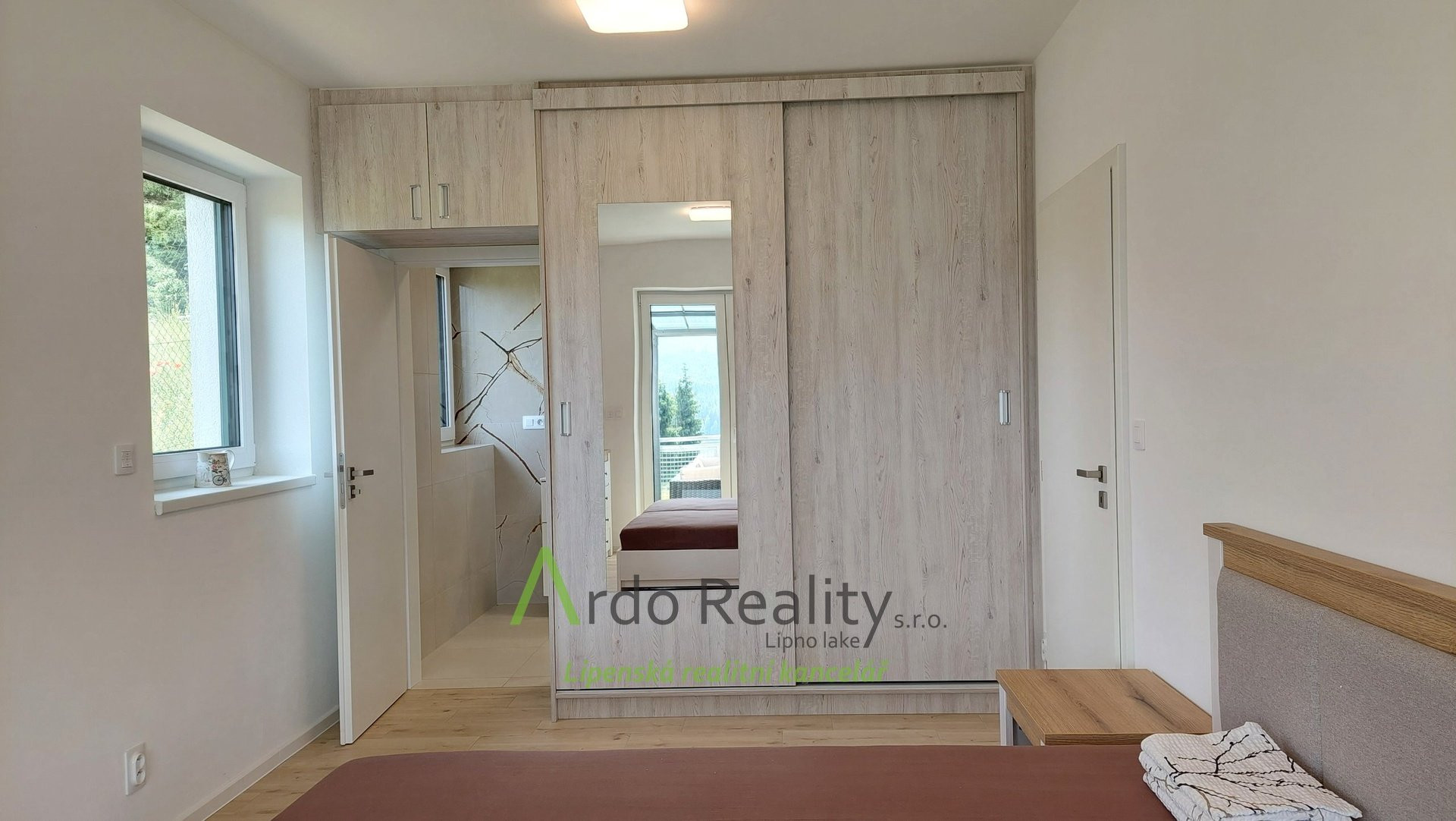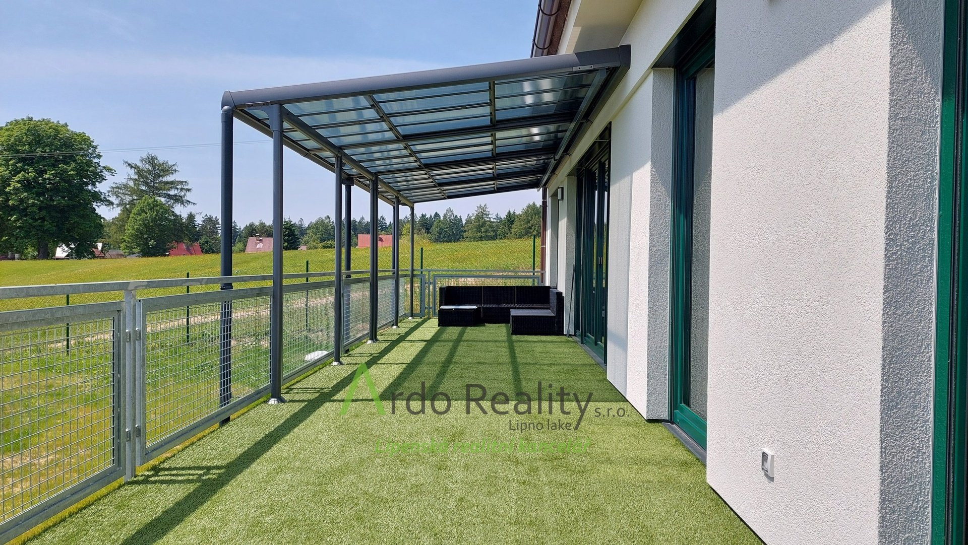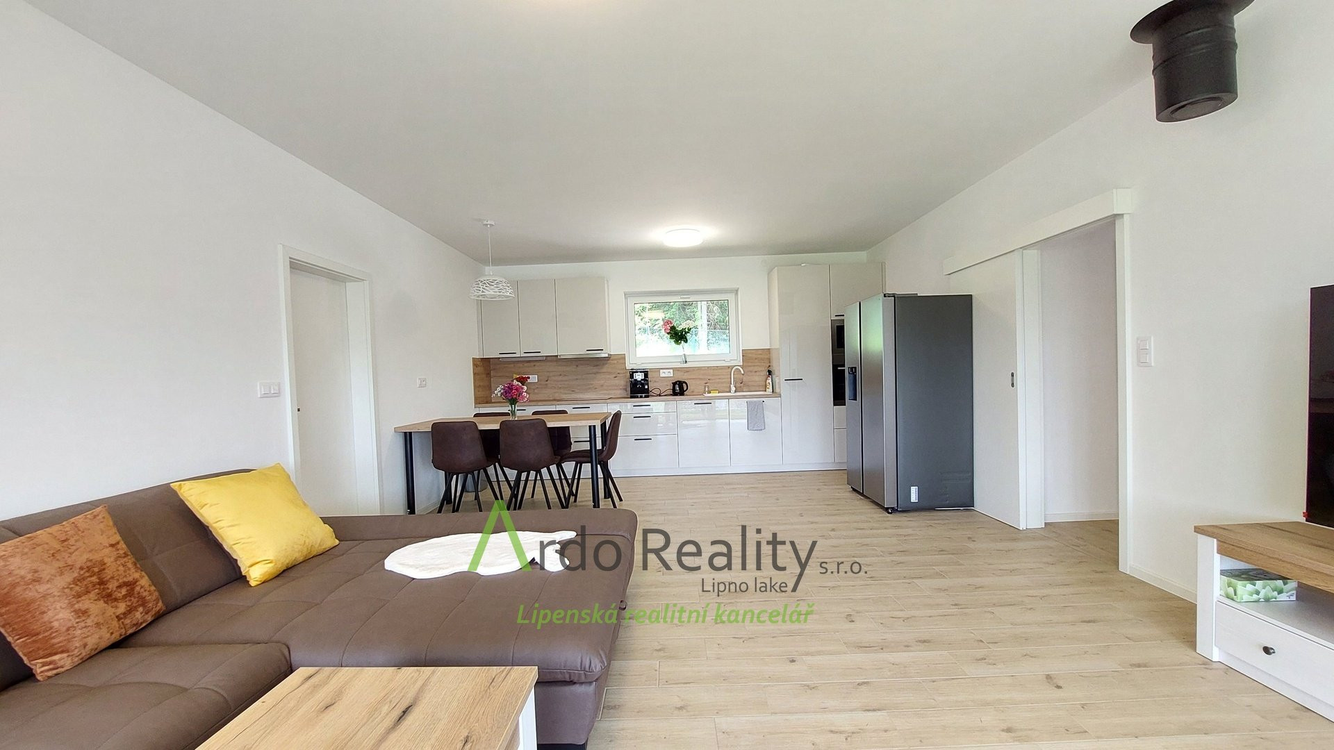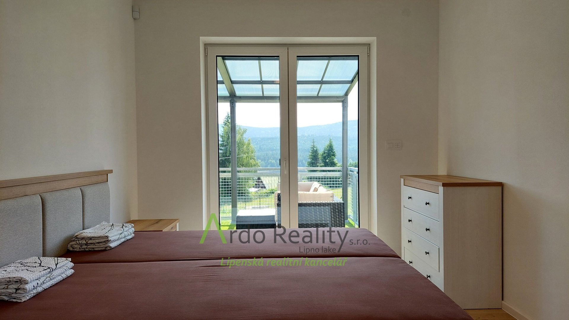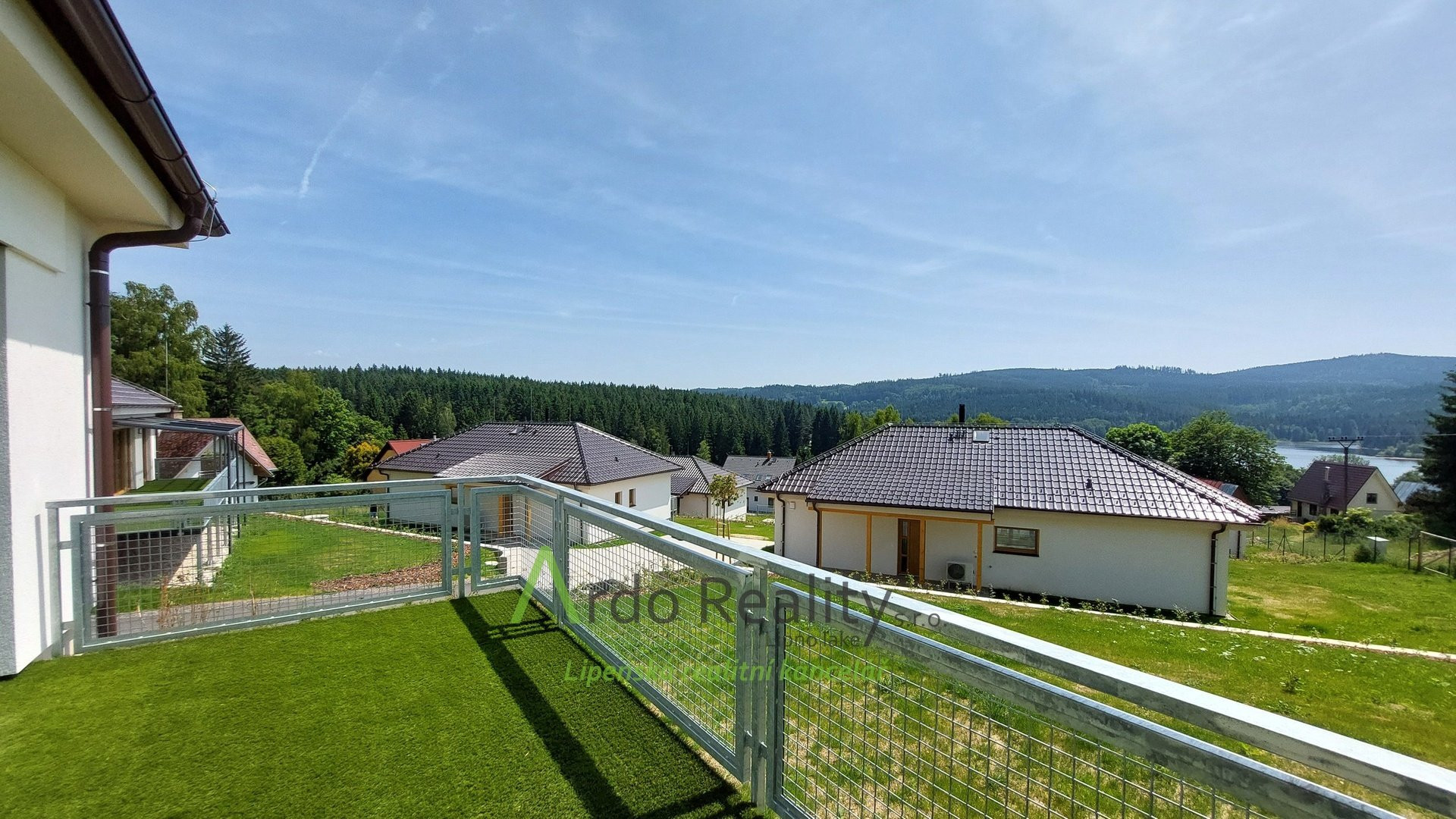 ДОЛГОСРОЧНАЯ АРЕНДА на фиксированный срок 5 лет или по договоренности, с целью предоставить арендаторам возможность с радостью принять и использовать весь дом и участок как полноправные владельцы. Строительство шести одинаковых домов, отвечающих самым высоким стандартам, недалеко от курортного города Фримбурк, практически на берегу озера Липно, только что завершено. Представляем вашему вниманию безбарьерный бунгало, расположенный таким образом, что просторная терраса ориентирована на юг, с видом на озеро. Владельцы уже оборудовали этот дом, мы представляем его вам в качестве образца, и он будет сдаваться в аренду последним. Дома построены с использованием новейших технологий, очень энергоэффективны, отапливаются немецким тепловым насосом Viessman типа «воздух-вода», во всем доме тёплые полы. В гостиной также есть дымоход для установки печи-камина или камина. Здание построено из кирпича Porotherm толщиной 30 см, стены утеплены полистиролом толщиной 15 см, потолок утеплён толщиной 18 см, окна с тройным остеклением и рольставнями с электроприводом. Крыша шатровая, керамическое покрытие произведено немецким производителем Roben. На чердак можно подняться по складной лестнице. Планировка дома следующая: спальня родителей с собственной ванной комнатой с душем и туалетом с биде, а также просторная гостиная со встроенной кухней Schüller, столешница с мойкой Blanco, шкафами и техникой Electrolux занимает всю длину комнаты. Подведены вода и электричество к американскому холодильнику с льдогенератором. В этой комнате можно установить каминную печь, что обеспечит приятную атмосферу в холодные дни. Во второй части дома есть ещё две комнаты, из которых также можно выйти на солнечную террасу. В конце коридора находится отдельный туалет с небольшой раковиной, а последнее, но не менее важное помещение – просторная ванная комната с отдельно стоящей ванной, душем и раковиной. Перед входной дверью находится защитный тамбур, где расположен наружный блок системы отопления, а также выполнена электроподготовка для установки зарядной станции для автомобиля, откуда возможен только вход в дом. Здесь же находится кладовая, место для большого шкафа для хранения вещей, а также вход в техническое помещение. Здесь же можно спрятать ещё один удобный шкаф для хранения необходимых вещей, в основном внутреннего блока теплового насоса, гидроаккумулятора с управлением подачей воды и современной системы водоподготовки Watex, обеспечивающей высочайшее качество питьевой воды. Осталось ещё достаточно места для стиральной машины и сушилки. Главное преимущество этого дома – большая открытая терраса площадью около 40 м² с прекрасным видом, которая на две трети покрыта раздвижной крышей. Эта терраса соединена со всеми жилыми комнатами дома. Дождевая вода собирается в подземном резервуаре объёмом 4000 литров и может использоваться для полива. На участке рядом с домом предусмотрена парковка на две машины. Каждый дом оснащён собственной системой безопасности Jablotron, подключенной к пульту охраны с выездом. Интернет предоставляется компанией Starnet. Как мы уже упоминали, на фотографиях показана модель меблированного дома. Остальные пять полностью готовых домов сдаются в аренду. По договоренности их можно обставить в том же или похожем стиле, либо по вашему желанию. Вся огороженная те