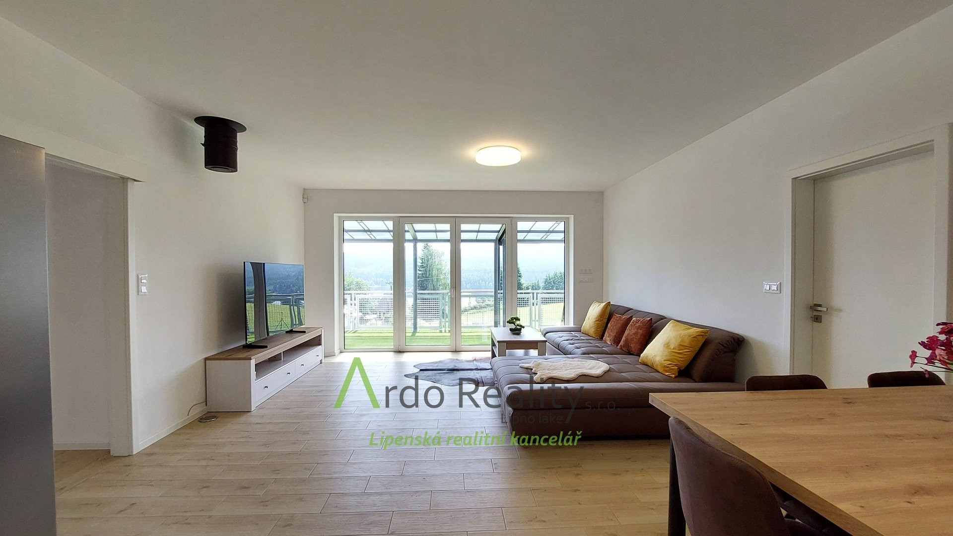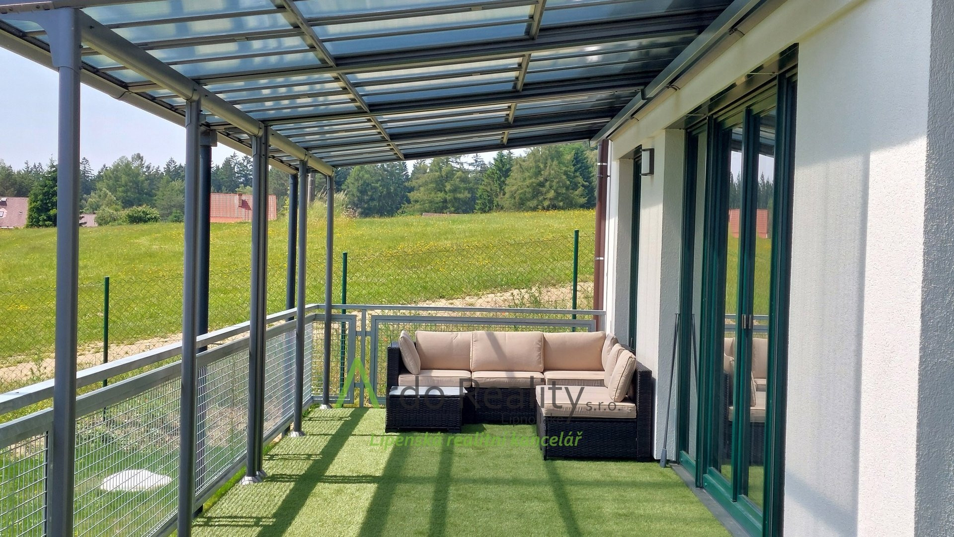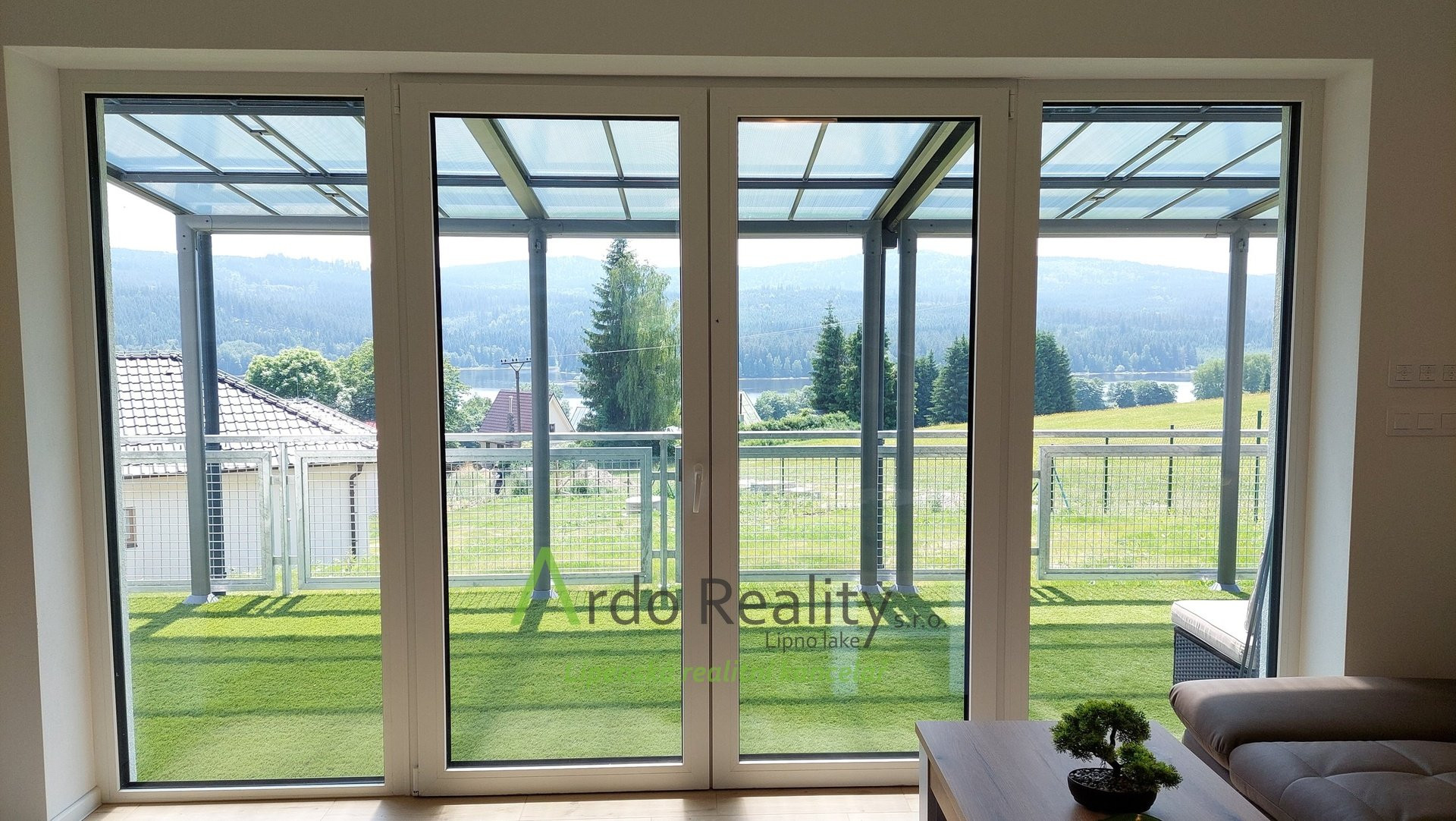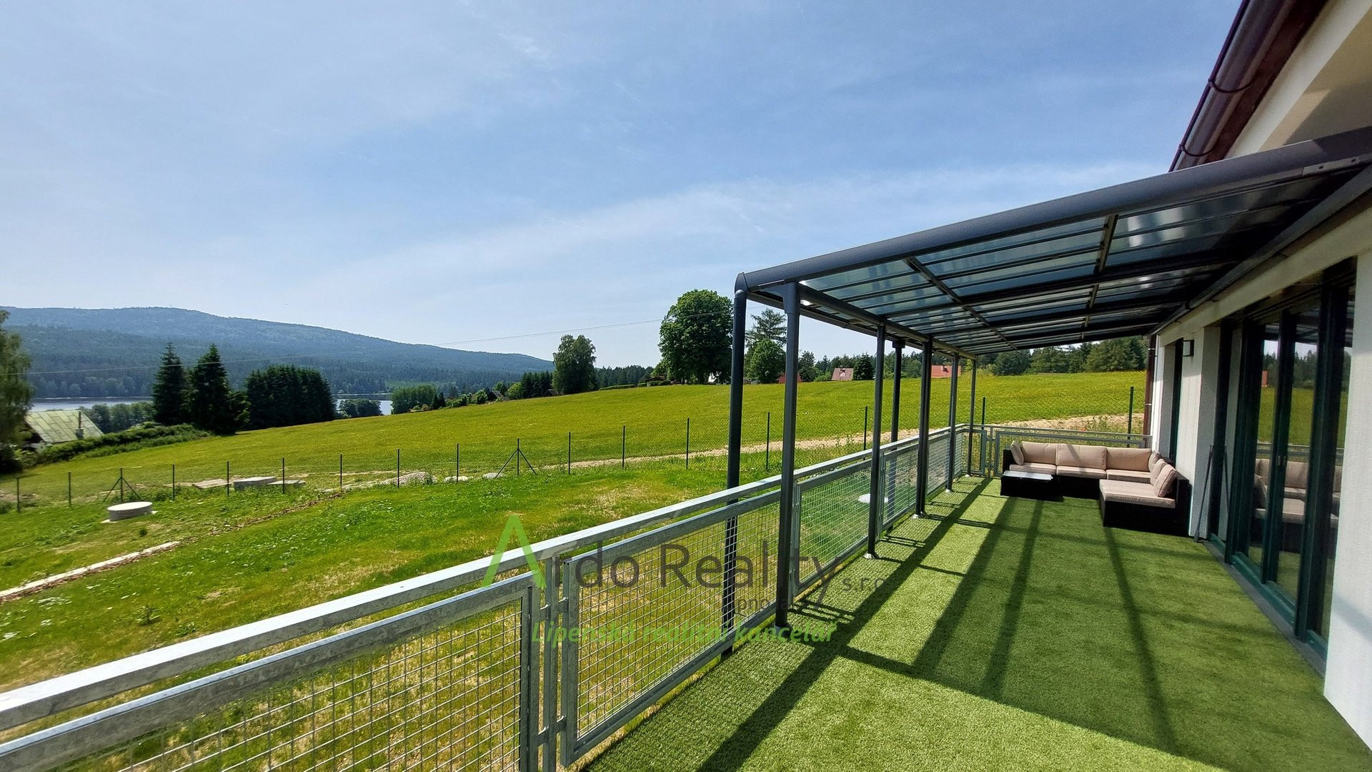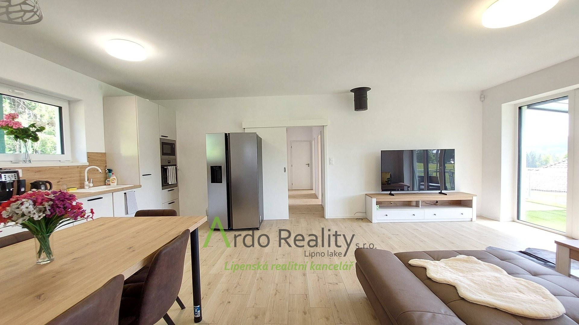 ДОЛГОСРОЧНАЯ АРЕНДА на фиксированный срок 5 лет или по договоренности, с целью предоставить арендаторам возможность с радостью принять и использовать весь дом и участок как полноправные владельцы. Строительство шести одинаковых домов, отвечающих самым высоким стандартам, недалеко от курортного города Фримбурк, практически на берегу озера Липно, только что завершено. Представляем вашему вниманию безбарьерный бунгало, расположенный таким образом, что просторная терраса ориентирована на юг, с видом на озеро. Владельцы уже оборудовали этот дом, мы представляем его вам в качестве образца, и он будет сдаваться в аренду последним. Дома построены с использованием новейших технологий, очень энергоэффективны, отапливаются немецким тепловым насосом Viessman типа «воздух-вода», во всем доме тёплые полы. В гостиной также есть дымоход для установки печи-камина или камина. Здание построено из кирпича Porotherm толщиной 30 см, стены утеплены полистиролом толщиной 15 см, потолок утеплён толщиной 18 см, окна с тройным остеклением и рольставнями с электроприводом. Крыша шатровая, керамическое покрытие произведено немецким производителем Roben. На чердак можно подняться по складной лестнице. Планировка дома следующая: спальня родителей с собственной ванной комнатой с душем и туалетом с биде, а также просторная гостиная со встроенной кухней Schüller, столешница с мойкой Blanco, шкафами и техникой Electrolux занимает всю длину комнаты. Подведены вода и электричество к американскому холодильнику с льдогенератором. В этой комнате можно установить каминную печь, что обеспечит приятную атмосферу в холодные дни. Во второй части дома есть ещё две комнаты, из которых также можно выйти на солнечную террасу. В конце коридора находится отдельный туалет с небольшой раковиной, а последнее, но не менее важное помещение – просторная ванная комната с отдельно стоящей ванной, душем и раковиной. Перед входной дверью находится защитный тамбур, где расположен наружный блок системы отопления, а также выполнена электроподготовка для установки зарядной станции для автомобиля, откуда возможен только вход в дом. Здесь же находится кладовая, место для большого шкафа для хранения вещей, а также вход в техническое помещение. Здесь же можно спрятать ещё один удобный шкаф для хранения необходимых вещей, в основном внутреннего блока теплового насоса, гидроаккумулятора с управлением подачей воды и современной системы водоподготовки Watex, обеспечивающей высочайшее качество питьевой воды. Осталось ещё достаточно места для стиральной машины и сушилки. Главное преимущество этого дома – большая открытая терраса площадью около 40 м² с прекрасным видом, которая на две трети покрыта раздвижной крышей. Эта терраса соединена со всеми жилыми комнатами дома. Дождевая вода собирается в подземном резервуаре объёмом 4000 литров и может использоваться для полива. На участке рядом с домом предусмотрена парковка на две машины. Каждый дом оснащён собственной системой безопасности Jablotron, подключенной к пульту охраны с выездом. Интернет предоставляется компанией Starnet. Как мы уже упоминали, на фотографиях показана модель меблированного дома. Остальные пять полностью готовых домов сдаются в аренду. По договоренности их можно обставить в том же или похожем стиле, либо по вашему желанию. Вся огороженная те